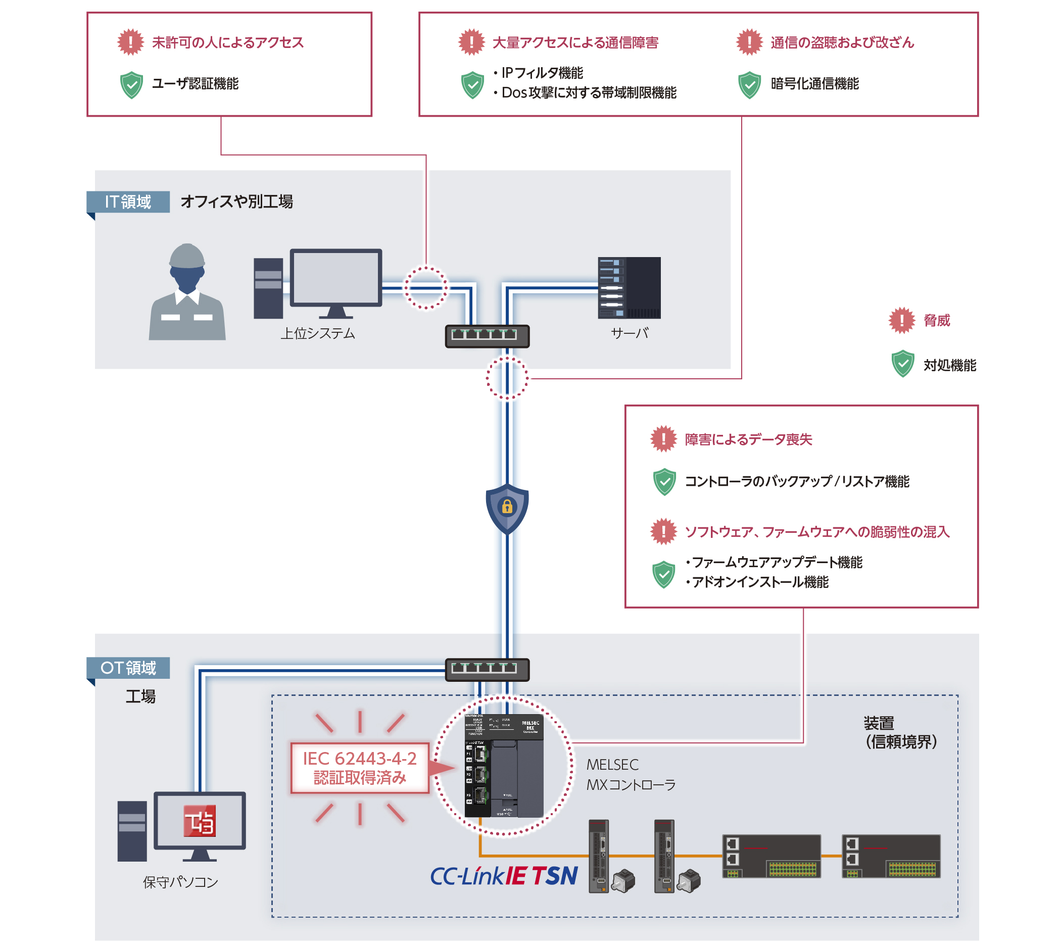 OT領域内外の通信の暗号化やユーザ認証機能により、盗聴や不正アクセスを阻止し、お客様の資産の流出や装置の誤動作を防止します。