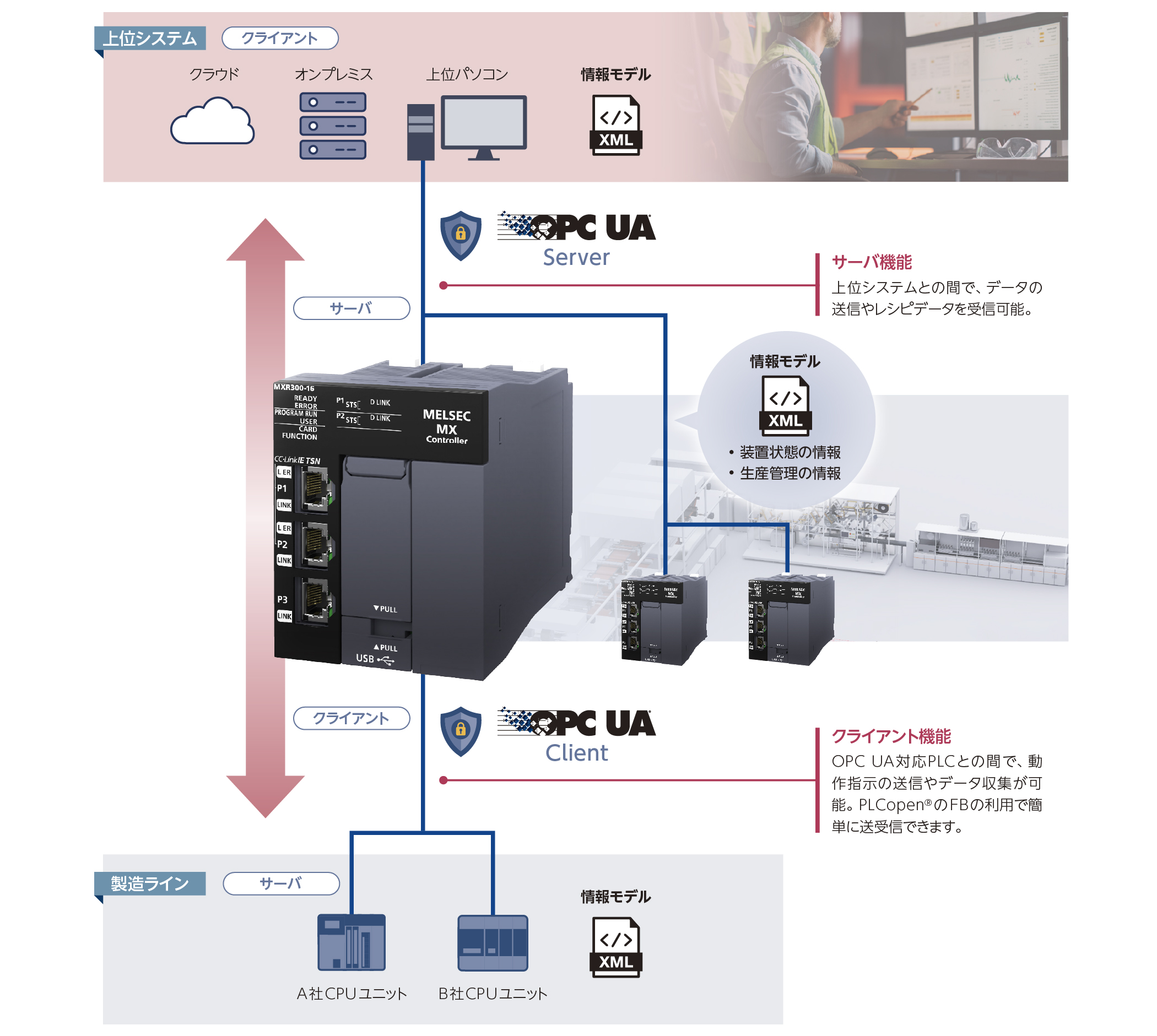 OPC UAサーバ機能とクライアント機能を標準搭載。MELSEC MXコントローラ1台で上位システムとの通信(サーバ機能)と、製造ライン内のOPC UA対応PLCとの通信(クライアント機能)を行うことができます。