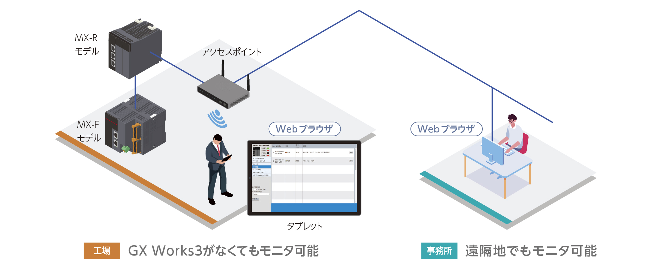 Webサーバ機能によりPC、タブレット、スマートフォンなど、さまざまな端末から装置の状況をモニタできます。