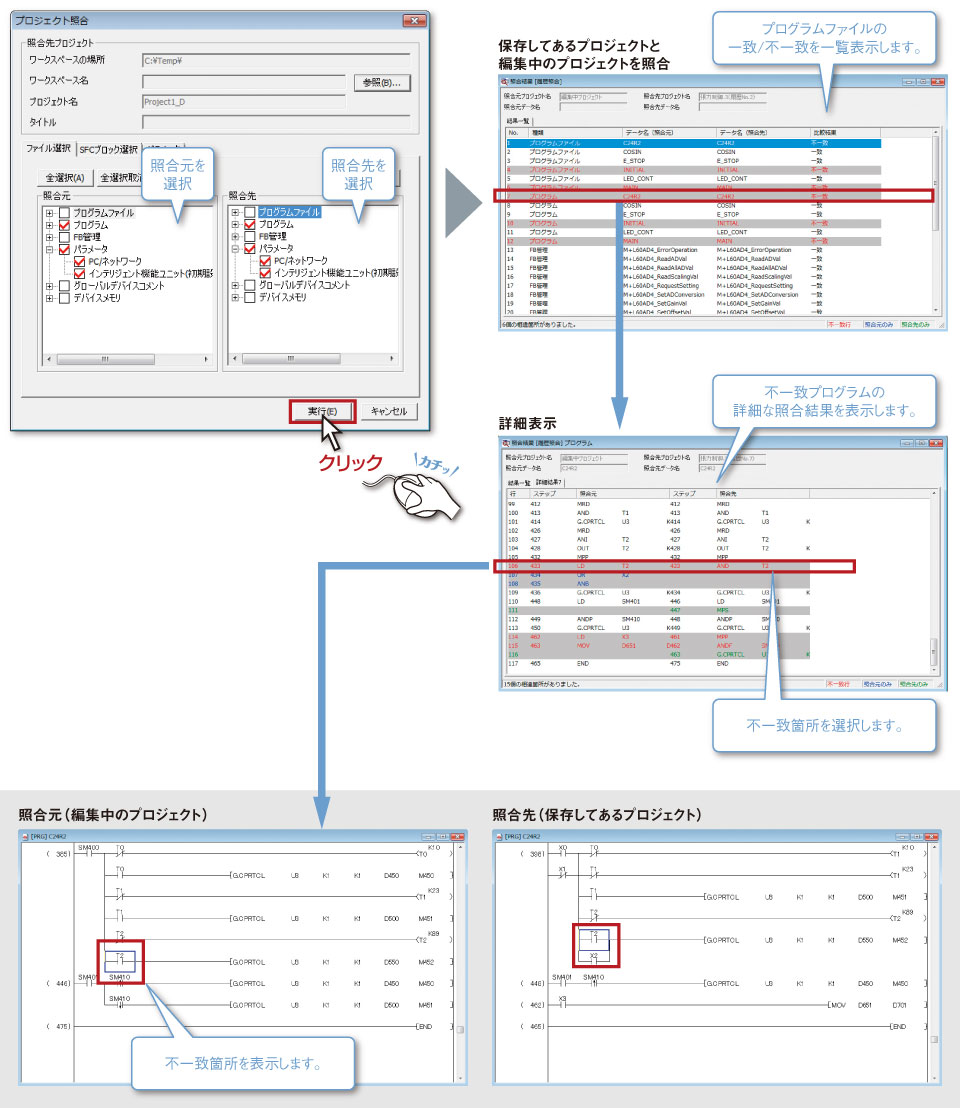 また、接続しているシーケンサ内のパラメータ・プログラムとの照合もできます。
