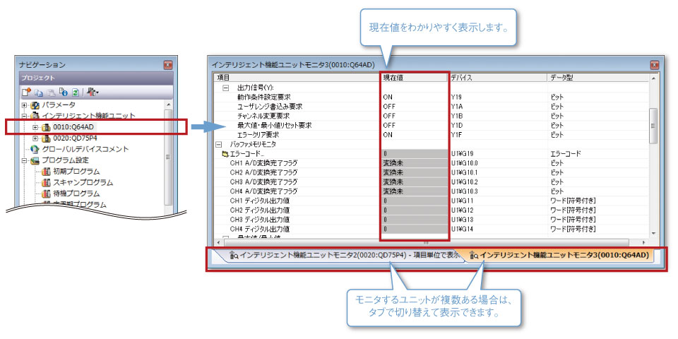 ラダープログラムを見ながらドッキングウィンドウで、インテリジェント機能ユニットのバッファメモリ/XY信号をモニタできます。バッファメモリの各アドレスの名称が表示されるため、バッファメモリが何に使われているかをマニュアルで調べる必要はありません。