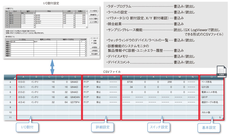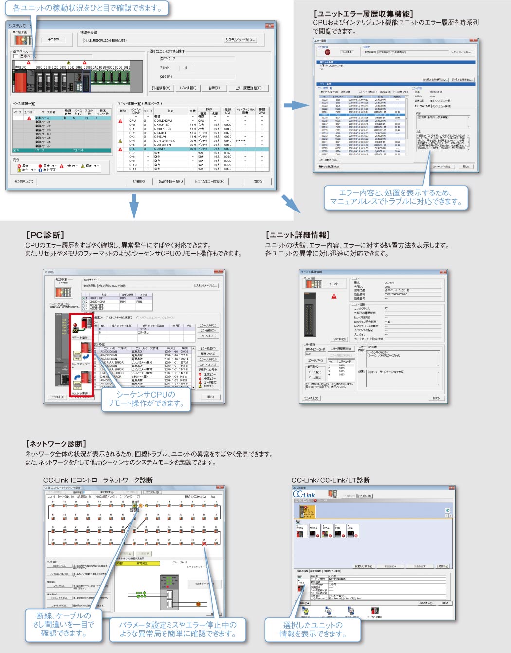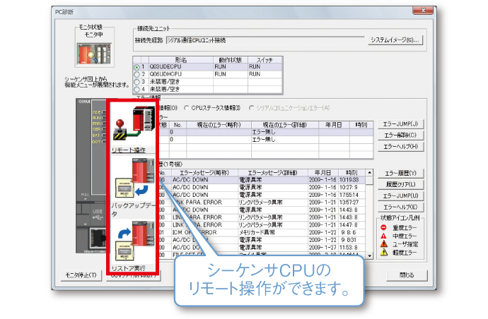 また、リセットやメモリのフォーマットのようなシーケンサCPUのリモート操作もできます。