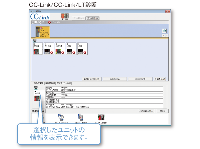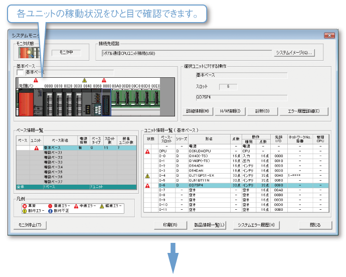 また、システム全体のモニタで、各ユニットの診断・詳細情報が表示されるため、問題発生箇所をすばやく確認できます。