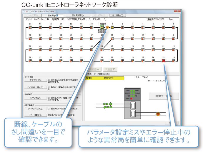 ネットワーク全体の状況が表示されるため、回線トラブル、ユニットの異常をすばやく発見できます。