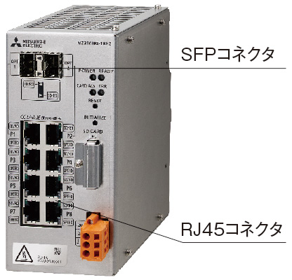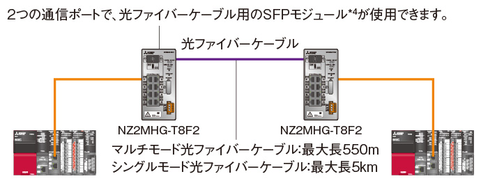 - SFPモジュール *4 を使用することで長距離配線が可能な光ファイバーケーブルを使用できるため、工場間などの長距離通信が必要なシステムでも使用できます