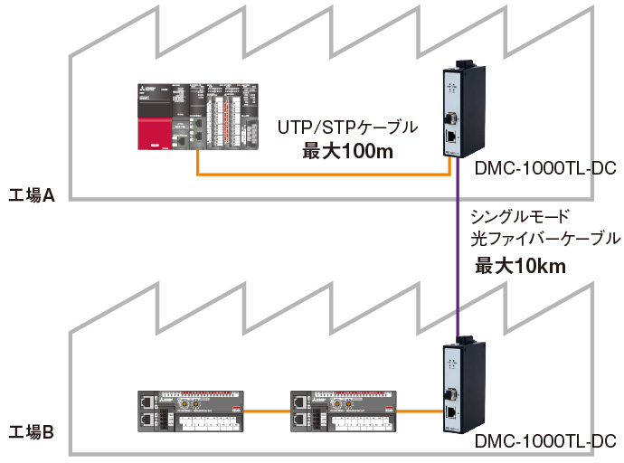 - 1000BASE-T/100BASE-TXを1000BASE-LX/SXに変換することで局間距離を延長できます(DMC-1000TL-DC:最大10km、DMC-1000TS-DC:最大550m)