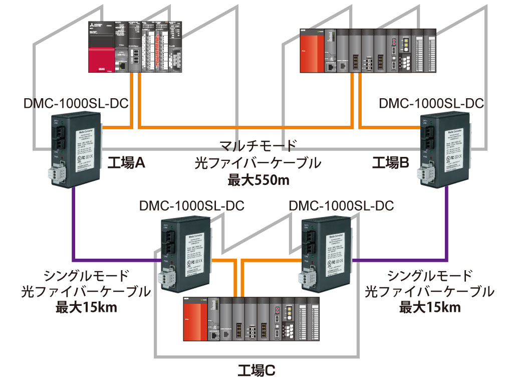 - 局間距離が550m以上離れている場合(工場A⇔C間、工場B⇔C間)、その間に本製品を2台入れ、シングルモード光ファイバーケーブルを接続することにより、局間距離を最大15kmに拡大できます