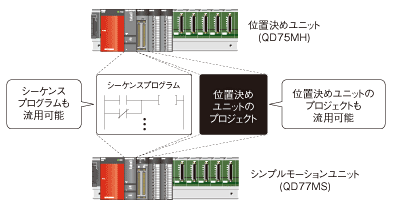 位置決めユニット(QD75MH)のプロジェクトやシーケンスプログラムは、シンプルモーションユニット(QD77MS)のプロジェクトに簡単に置き換え可能です。