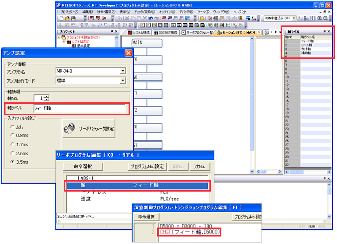 軸ラベル(軸の名称)を設定し、軸ラベルでプログラムすることが可能。