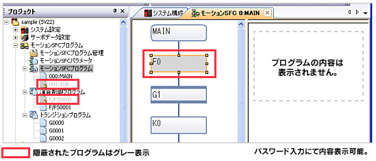 モーションSFCプログラムごとにパスワードによる表示/非表示を設定でき、