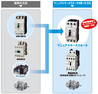 マニュアルモータスタータは、配線用遮断器とサーマルリレーの機能を一体化した機器です。この1台で過負荷、欠相、短絡からのモータ分岐開路の保護が省スペースで可能です。より確実な配線(コンタクト)、モータ保護を実現します。
