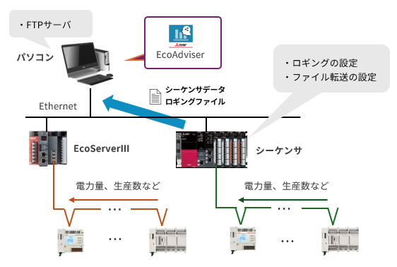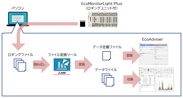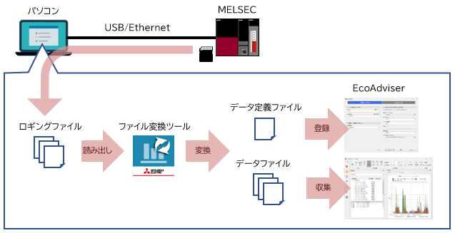 MELSECでロギングしたデータ(ロギングファイル)をパソコンに取り込み、本ソフトウェアにてEcoAdviserで収集可能な形式に変換します。