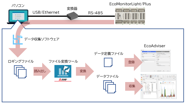 ロギングユニットでロギングしたデータ(ロギングファイル)をSDメモリカードからパソコンに取り込み、本ソフトウェアにてEcoAdviserで収集可能な形式に変換します。 - ②データ収集ソフトウェアの場合