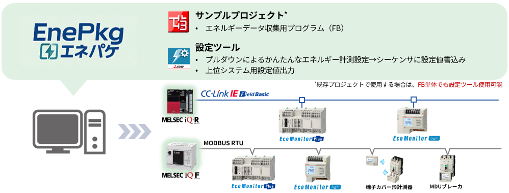 生産設備の見える化を支援する無償のエネルギーデータ収集パッケージは、サンプルプロジェクトと設定ツールで構成され、iQ-Rシリーズ(CC-Link IEフィールドネットワークBasic)とiQ-Fシリーズ(MODBUS RTU)に対応しています。