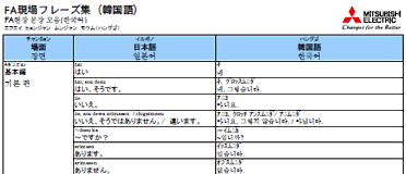 生産現場でよく用いられるフレーズを場面別(設計・製造・保守等)に整理し、FA現場フレーズ集に纏めました。現地スタッフとの韓国語、英語他でのスムーズなコミュニケーションの一助としてご利用ください。