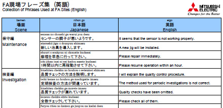 生産現場でよく用いられるフレーズを場面別(設計・製造・保守等)に整理し、FA現場フレーズ集に纏めました。英語での現地スタッフとのスムーズなコミュニケーションの一助としてご利用ください。