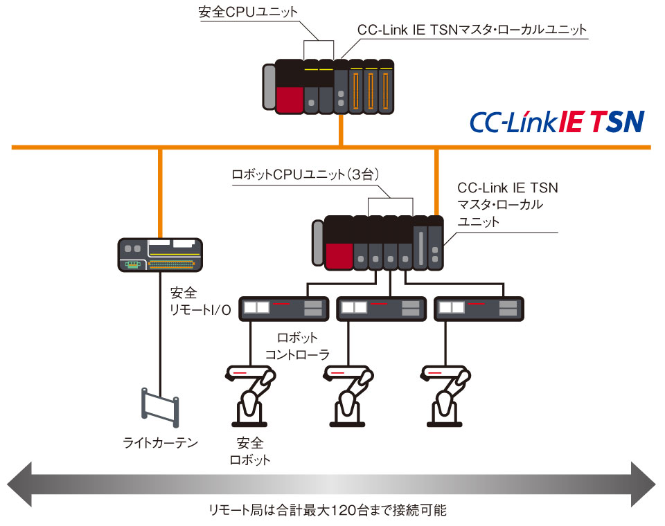 ロボットコントローラ CR800-Rは、安全リモートユニットに接続された安全機器を利用できます。一般通信用機器と安全通信用機器を別々に用意する必要はありません。