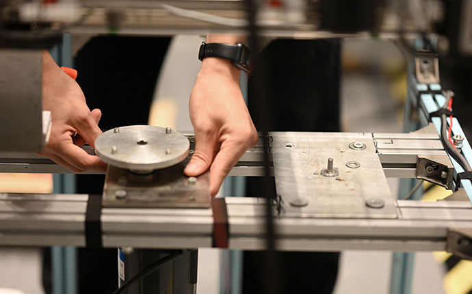 2023年7月28日決勝戦の朝、整然と区切られたスペースに、工具や機械がところ狭しと並べられた会場の中で、制限時間3時間の競技が始まった。加工サンプルとして与えられた不定形の定規を製造する加工機を、三菱電機のFA製品で組み上げる課題に学生たちは一斉に取り掛かる。サンプルと寸分違わない定規を再現できるかが勝負だ。さらに今回のコンテストから、ハードウェア(機器)の製作に加えて、デジタルツイン ※ を再現するソフトウェア・インターフェースの開発も課題に入り、難易度はさらに上がっていた。
