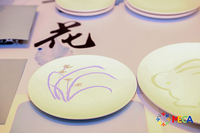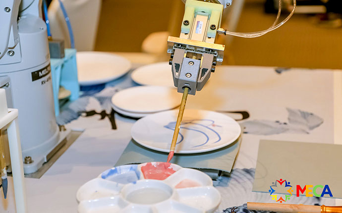 一方で、技術力の高さに関係者が注目した作品が「青花 ※ 」だった。三菱電機FAの産業用ロボットが絵筆を巧みに操り、白磁の皿に数種類の色で下絵を描いていく。絵皿が自動で次々と仕上がっていく様子に目を奪われた。下絵は微妙なカスレ、濃淡が表現できており、仕上がりの質の高さに驚いた。ロボットが描いたようにはとても見えない。